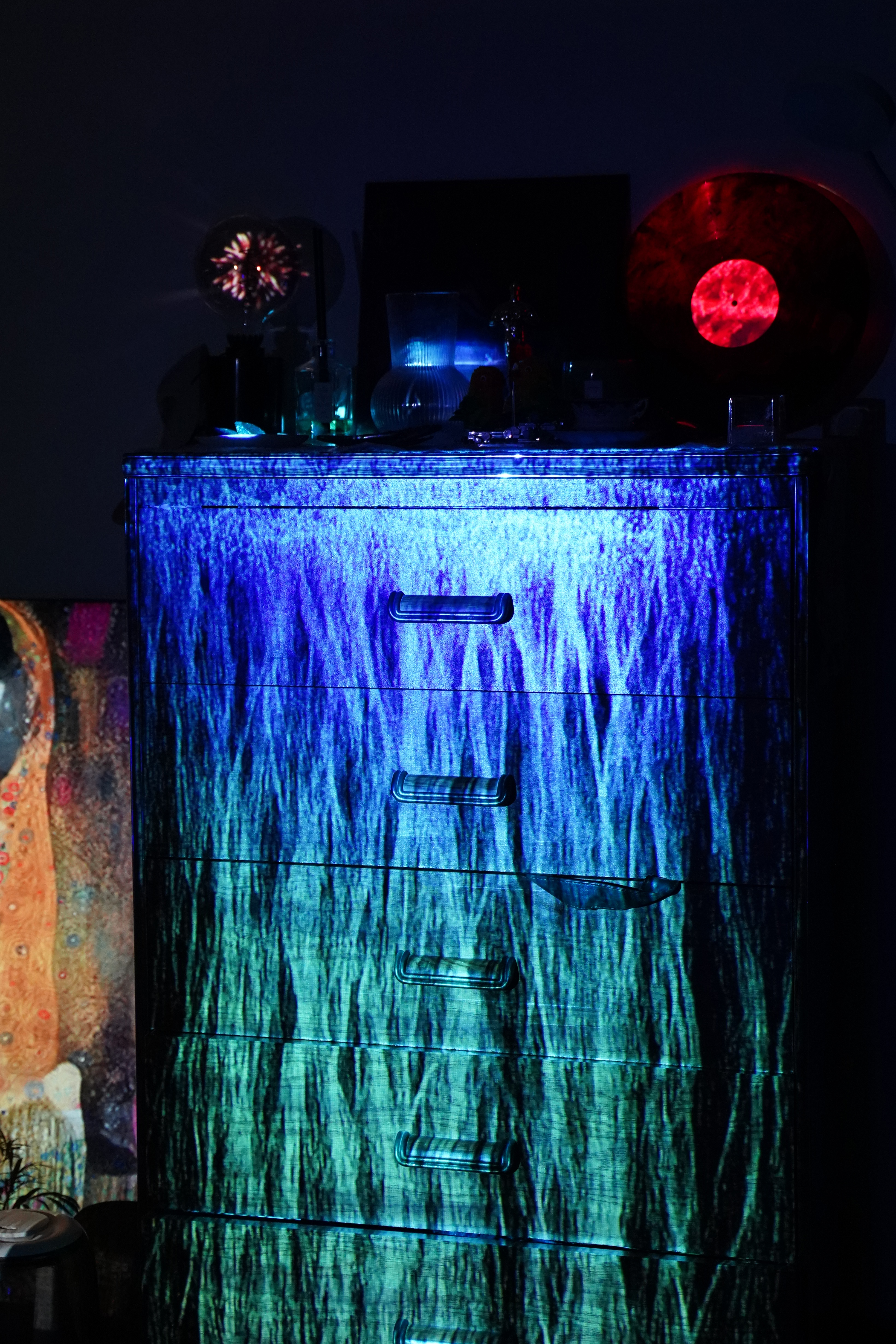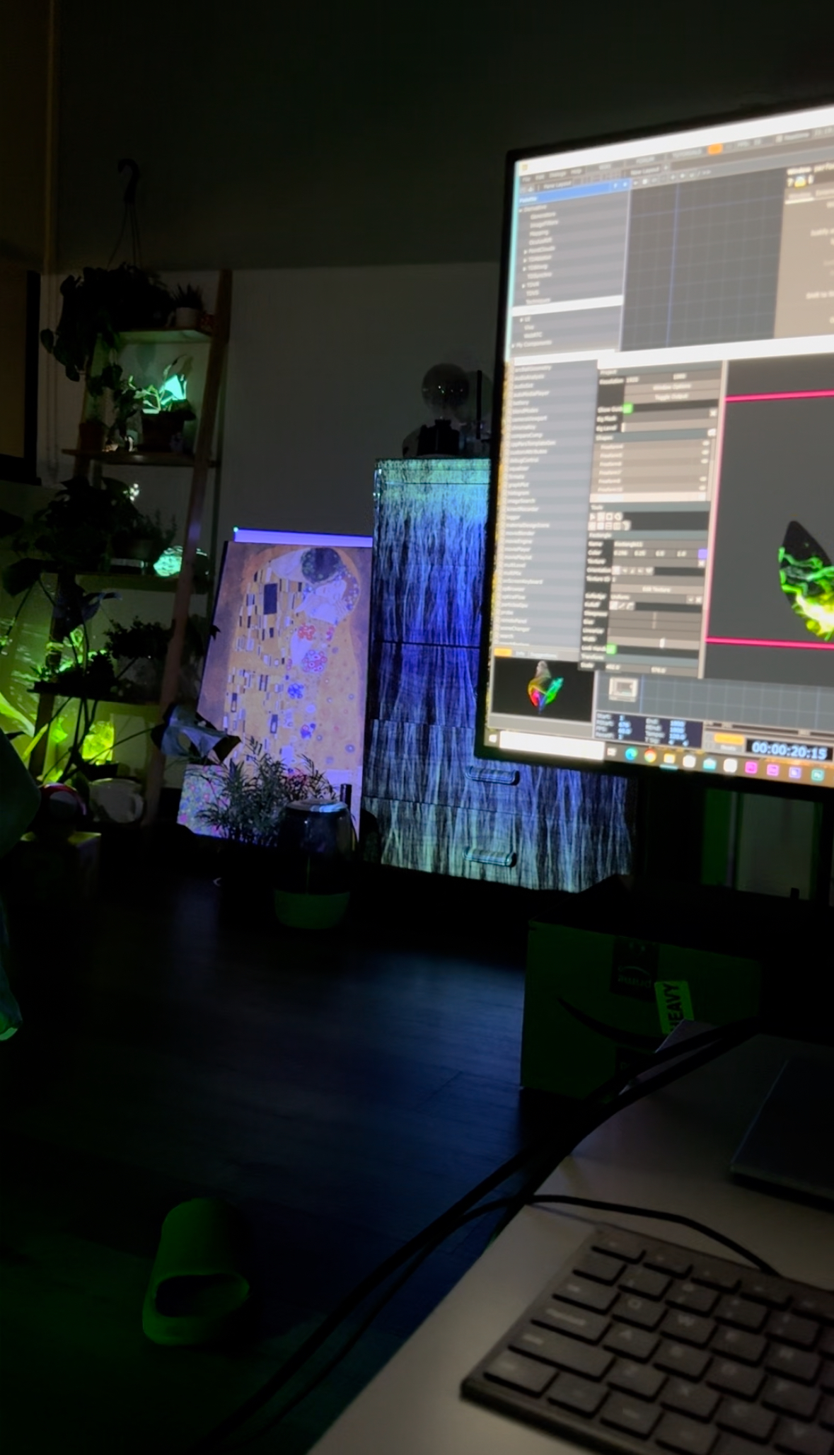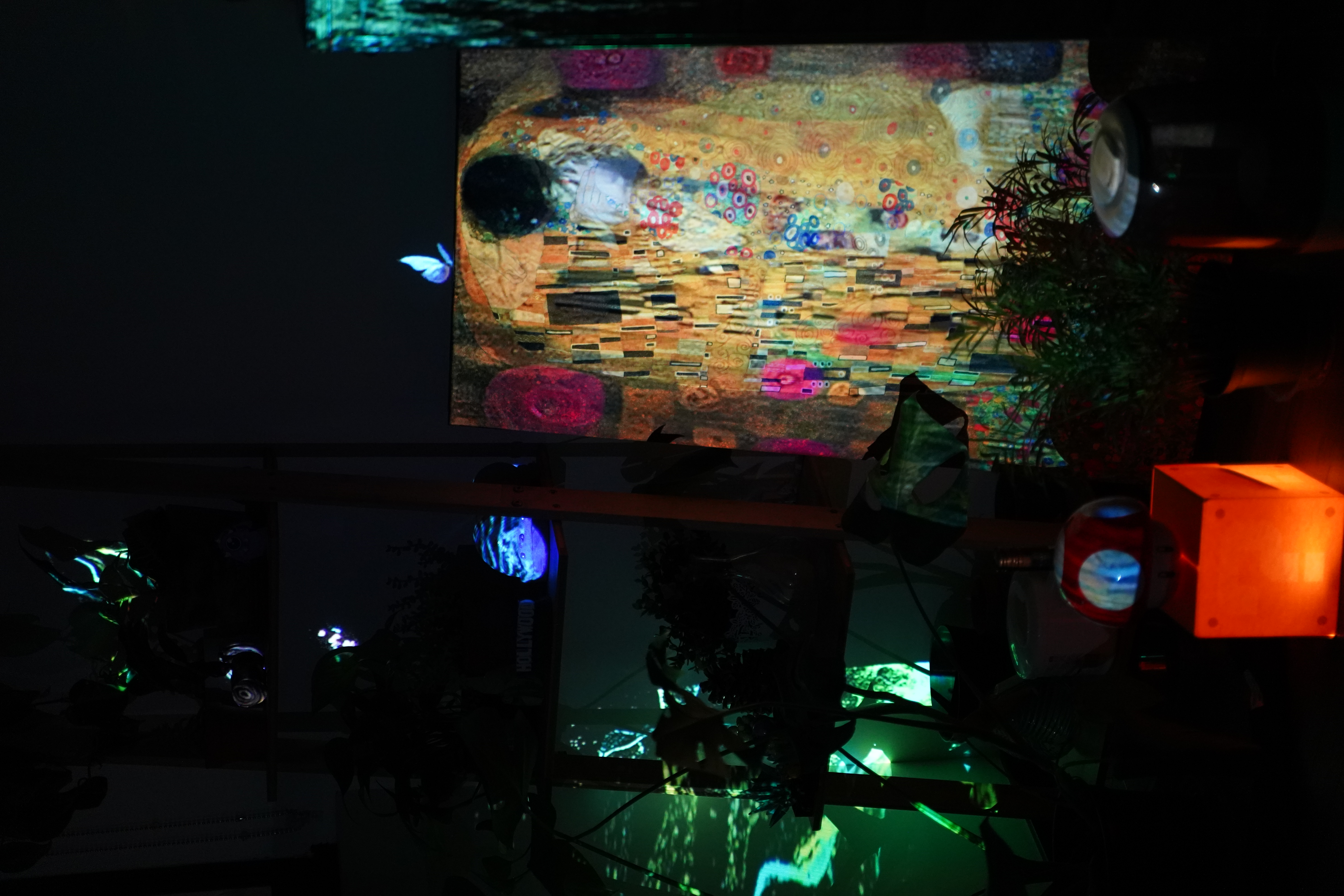 I also incorporated an AI workflow into this piece. The Kiss by Gustav Klimt is one of my favorite paintings, and I have a decorative version in my room. I wanted to see how it would come to life with movement and artistic animation. I tried out the StreamDiffusion plugin in TouchDesigner and mapped the animated painting onto the physical version in my space. The result brings the artwork to life, making it feel dynamic and vivid.
